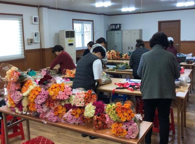 농가들이 장미꽃다발을 만들고 있는 모습.