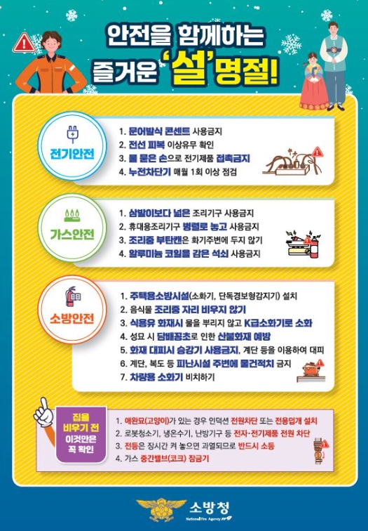 특히 설 명절 기간에는 귀성·귀경 및 가족 모임으로 인해 전기장판, 전기히터, 멀티탭 사용량이 급증하고, 장시간 사용으로 과열 위험이 커지는 만큼 문어발식 콘센트 사용 금지, 손상된 전선 즉시 교체, 누전차단기 정상 작동 여부 점검이 중요하다고 강조했다.