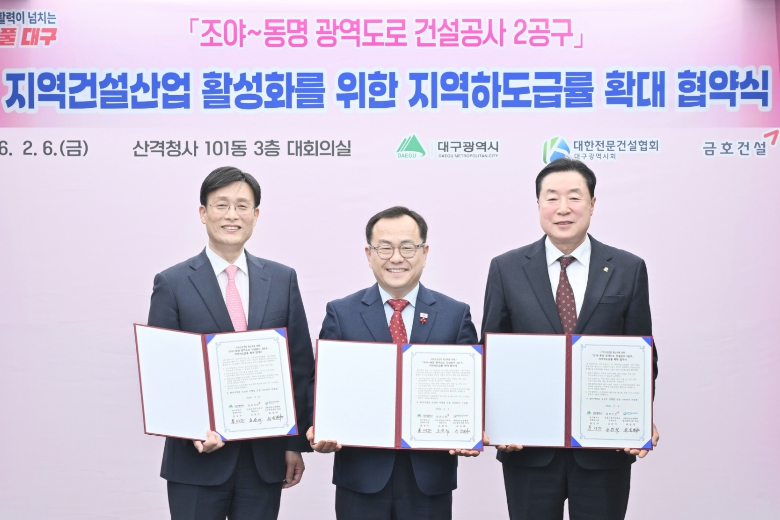 [시사토픽뉴스] 대구광역시는 2월 6일오후 2시 시청 산격청사에서 ‘조야~동명 광역도로건설 2공구’ 공사에 수반되는 하도급의 지역업체 참여 비율 확대를 위해 금호건설㈜, 대한전문건설협회 대구시회와 3자 협약을 체결했다.