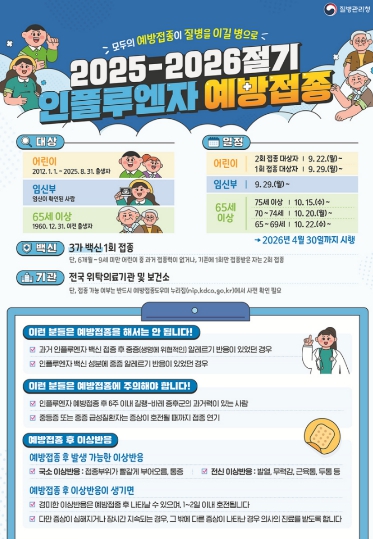 이재홍 대구광역시 보건복지국장은 “설 명절은 온 가족이 함께 모이는 시기인 만큼, 건강하고 안전하게 보내기 위해서는 예방접종이 필수적”이라며 “아직 접종하지 않은 시민들께서는 연휴 전 가까운 의료기관을 방문해 독감 예방접종을 완료해 주시길 바란다”고 당부했다.