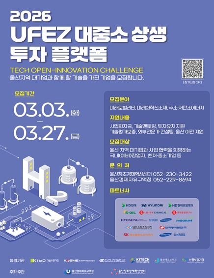 [시사토픽뉴스] 울산경제자유구역청은 ‘2026년 울산경제자유구역(UFEZ) 대중소 상생투자 기반(플랫폼) 공모전’을 개최한다고 밝혔다.