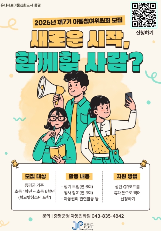 [시사토픽뉴스]충북 증평군이 아동의 시선에서 지역 정책을 함께 만들어갈 ‘제7기 증평군 아동참여위원회’ 위원 35명을 오는 3월 31일까지 공개 모집한다.