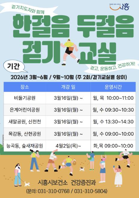 걷기교실은 3월부터 6월, 9월부터 10월까지 주 2회(권역별 상이) 운영된다. 상반기 프로그램은 ▲비둘기공원(월·목 10:00~11:00) ▲은계어린이공원(월·수 09:30~10:30) ▲새말공원·신천천(월·수 13:30~14:30) ▲목감동 산현공원(월·수 09:00~10:00)에서 3월 16일부터 운영된다. ▲능곡동 숲새재공원은 4월 2일부터 화·목 09:00~10:00에 진행된다. 하반기 일정은 9월부터 10월까지 권역별 여건에 맞춰 동일하게 운영될 예정이다.