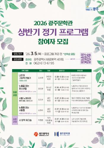 [시사토픽뉴스]광주광역시는 시민의 문학적 감수성과 창작 역량을 키우기 위해 ‘2026년 광주문학관 상반기 정기 프로그램’을 운영한다.