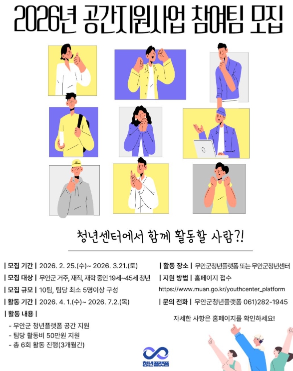 [시사토픽뉴스]무안군청년플랫폼은 청년들의 다양한 모임 활동을 지원하고 청년센터 공간 활용을 활성화하기 위해 ‘2026년 공간지원 사업’ 참여팀을 모집한다고 밝혔다.