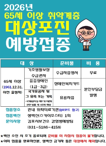 김포시, 65세 이상 취약계층 대상포진 예방접종 지원