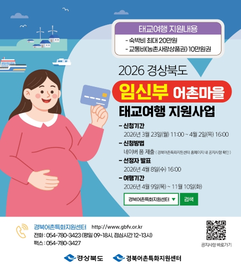 [시사토픽뉴스] 경상북도는 저출생 문제를 해결하고 어촌지역 활성화를 위하여 3월 23일부터‘임신부 어촌마을 태교여행’모집을 실시한다고 밝혔다.