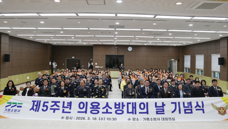 [시사토픽뉴스]가평소방서는 18일 3층 대강당에서 지역사회 안전을 위해 헌신해 온 의용소방대의 노고를 기리고 사기를 진작하기 위한 ‘제5주년 의용소방대의 날 기념행사’를 개최했다고 밝혔다.