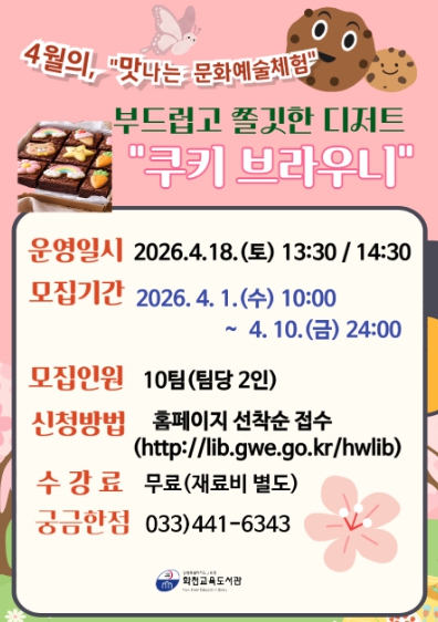 이번 특강은 4월 11일부터 5월 16일까지 6회 진행되며, 수강신청은 3월 20일 10시부터 화천교육도서관 누리집에서 접수한다.