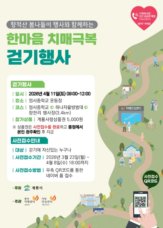 [시사토픽뉴스] 충남 계룡시는 오는 4월 11일 9시부터 엄사면 향한리 일원에서 치매 예방의 중요성을 알리고, 건강한 계룡시를 만들기 위한 “한마음 치매극복 걷기 행사”를 개최한다고 밝혔다.