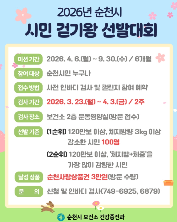 [시사토픽뉴스] 순천시는 시민들의 일상 속 걷기 실천을 유도하고 건강생활 습관 형성을 위해 ‘2026년 시민 걷기왕 선발대회’를 운영한다고 밝혔다.