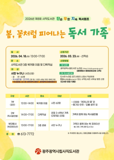 [시사토픽뉴스]광주광역시 시립도서관은 사직도서관에서 가족이 함께 책을 읽고 지식을 나누는 ‘제8회 단무지(단순·무한·지속) 독서캠프’를 오는 4월18일 개최키로 하고, 캠프에 참가할 초등생 가족을 23일부터 선착순 모집하고 있다.