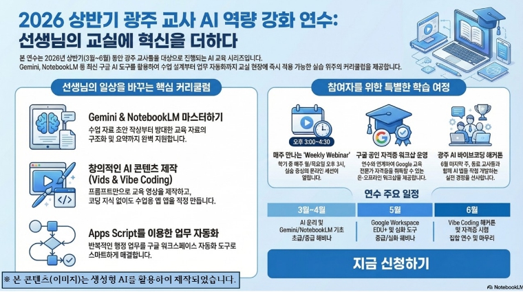[시사토픽뉴스]광주시교육청은 오는 26일부터 초·중·고·특수학교 교원 280여 명을 대상으로 ‘2026 상반기 생성형 AI 역량 강화 연수’를 운영한다.
