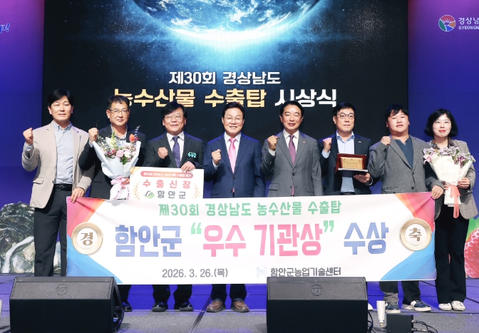 [시사토픽뉴스] 함안군은 지난 26일 창원컨벤션센터에서 열린 ‘제30회 경남도 농수산물 수출탑 시상식’에서 우수 기관으로 선정돼 수출 신장상을 수상했다고 밝혔다.
