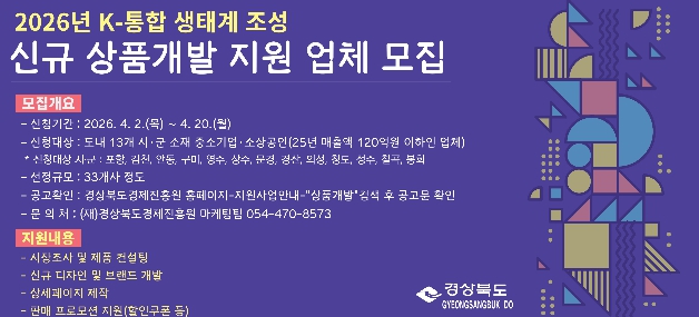[시사토픽뉴스] 경상북도는 도내 유망 중소기업·소상공인의 제품 경쟁력 강화를 위해 ‘2026년 K-통합 마케팅 생태계 조성사업’의 일환으로 상품 기획부터 디자인·마케팅까지 전 과정을 지원하는‘신규 상품개발 지원사업’에 참여할 기업을 모집한다.