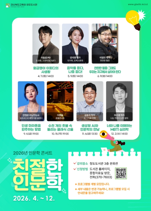 [시사토픽뉴스] 경상북도교육청 청도도서관은 2026년 인문학 콘서트 ‘친절한 인문학’을 4월부터 12월까지 총 7회에 걸쳐 운영한다고 밝혔다.
