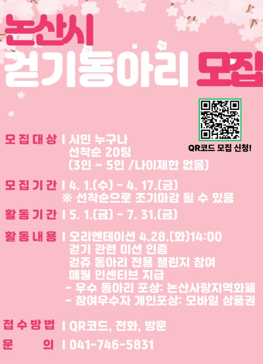 백성현 논산시장은 “걷기는 일상에서 가장 쉽게 실천할 수 있는 건강관리 방법”이라며 “이번 프로그램이 시민들의 자발적인 건강생활 실천을 확산시키는 계기가 되길 기대하며 앞으로도 다양한 정책을 통해 시민건강증진에 힘쓰겠다”라고 말했다.