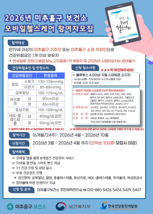 한편, 보건소는 모바일 헬스케어 사업을 통해 비대면 건강관리 환경을 조성하고, 주민의 지속적인 건강생활 실천을 유도하는 등 예방 중심 공공보건 서비스 체계를 강화해 나갈 계획이다. 모바일 헬스케어 사업 참여 및 자세한 사항은 미추홀구보건소 주민체력관리실로 문의하면 된다.