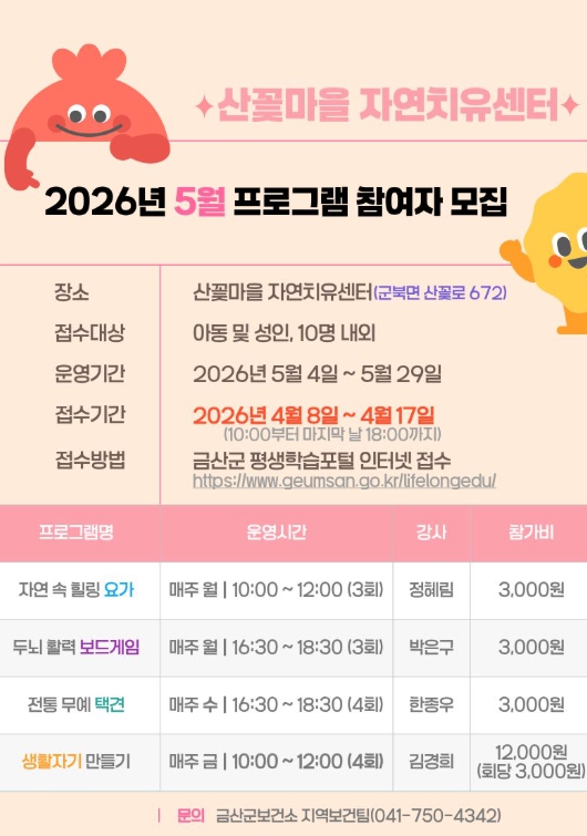 [시사토픽뉴스] 금산군은 오는 8일부터 17일까지 산꽃마을 자연치유센터 5월 프로그램 참여자를 모집한다.