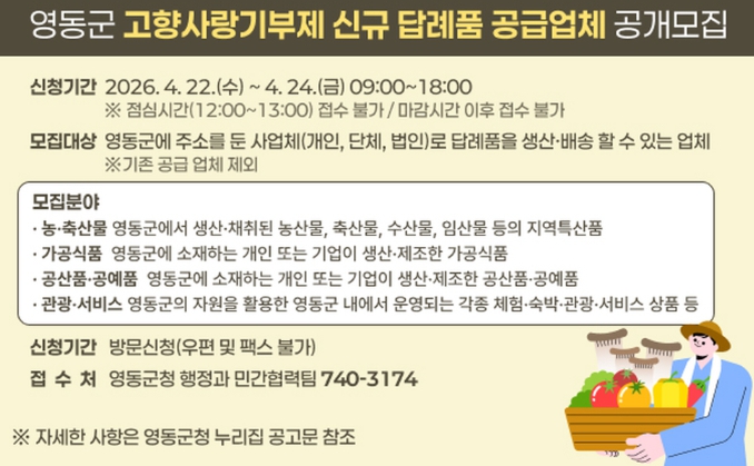 [시사토픽뉴스] 충북 영동군이 2026년도 고향사랑기부제 신규 답례품 공급업체를 모집한다고 8일 밝혔다.