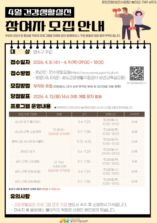 [시사토픽뉴스] 연수구 송도건강생활지원센터는 오는 8일부터 2일간 ‘건강생활실천 프로그램 2기’ 참여자를 모집한다.