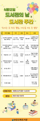[시사토픽뉴스] 보은교육도서관은 오는 4월 12일부터 18일까지 ‘도서관의 날·도서관주간’을 맞아 지역 주민의 독서문화 확산을 위한 다양한 프로그램을 운영한다고 밝혔다.