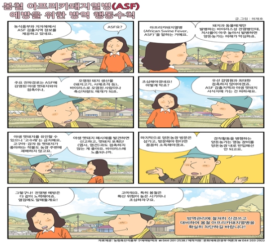 정창근 동물방역과장은 “봄철은 영농활동 증가와 야생멧돼지 활동 증가로 아프리카돼지열병(ASF) 유입 위험이 높은 시기”라며, “농가에서는 출입자 및 차량 통제, 농기계‧차량 소독 등 기본 방역수칙을 철저히 준수해 줄 것”을 당부했다.