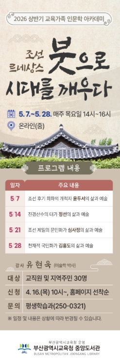 [시사토픽뉴스] 부산광역시립중앙도서관은 오는 5월 7일부터 28일까지 매주 목요일마다 4회에 걸쳐 교직원 및 지역주민 30명을 대상으로 온라인(ZOOM)을 통해 인문학 아카데미 ‘조선 르네상스, 붓으로 시대를 깨우다’를 운영한다.