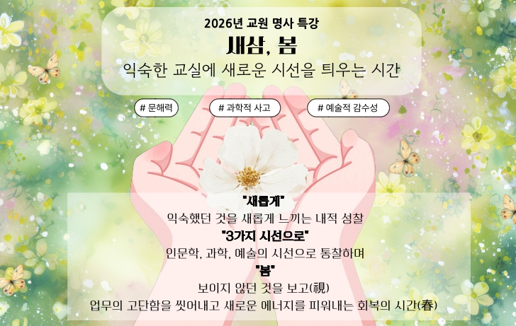 [시사토픽뉴스] 부산광역시교육청교육연수원은 오는 21일부터 6월 2일까지 3회에 걸쳐 연수원 대강당에서 교원 및 교육전문직원 400여 명을 대상으로 2026 명사 초청 특강 ‘새삼 봄’을 운영한다.