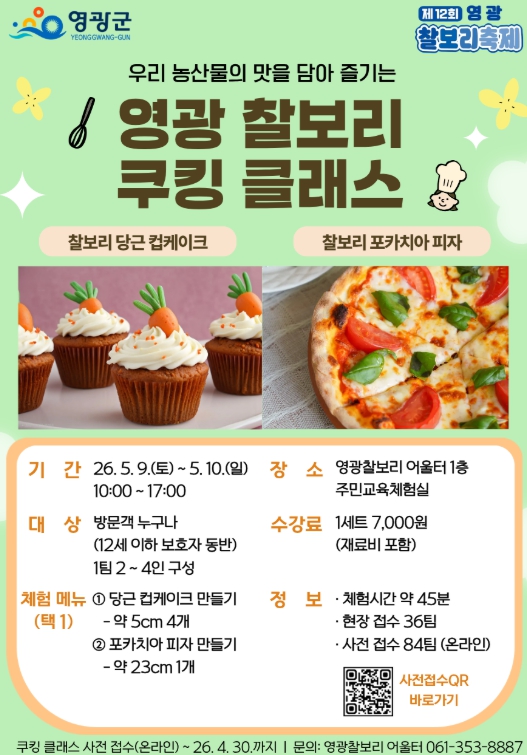 [시사토픽뉴스] 영광군은 오는 5월 9일부터 5월 10일까지 열리는 ‘영광 찰보리 축제’ 기간 동안, 찰보리를 활용한 체험 프로그램인 ‘찰보리 쿠킹클래스’를 운영한다고 밝혔다.