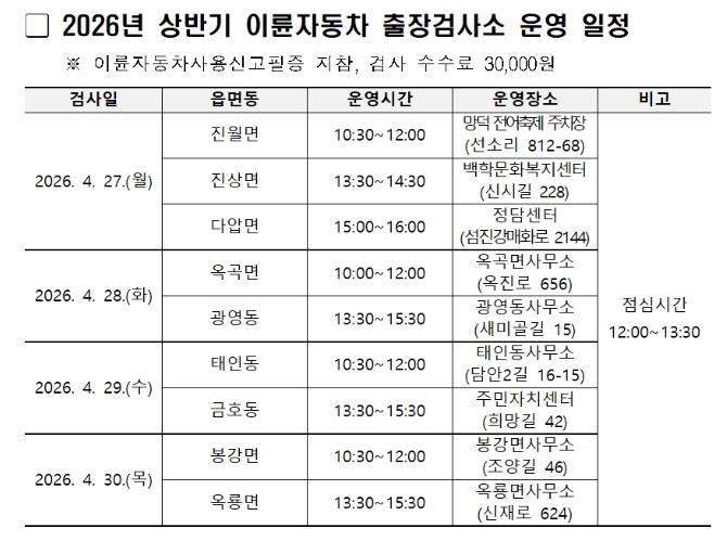 광양시, 2026년 상반기 이륜자동차 출장검사소 운영