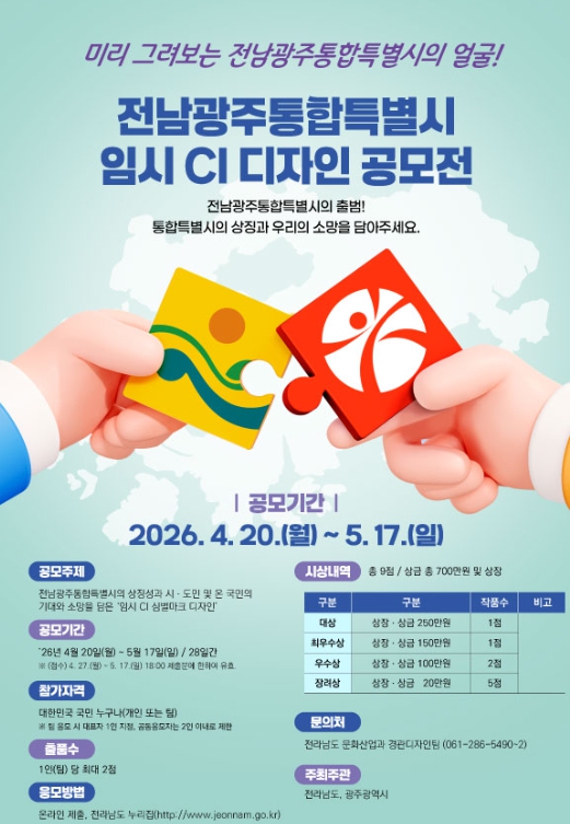 [시사토픽뉴스] 광주광역시와 전라남도는 ‘전남광주통합특별시 임시 상징물(CI) 디자인 공모전’을 오는 5월 17일까지 개최한다.