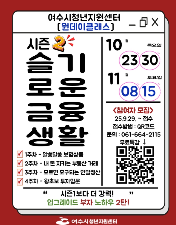 [시사토픽뉴스]여수시는 오는 10월 23일 오후 6시 30분 여수시청년지원센터에서 청년들의 금융 이해도 향상과 건전한 금융 습관 형성을 위한 무료 특강 ‘시즌2 슬기로운 금융생활’ 일일 강좌를 운영한다.