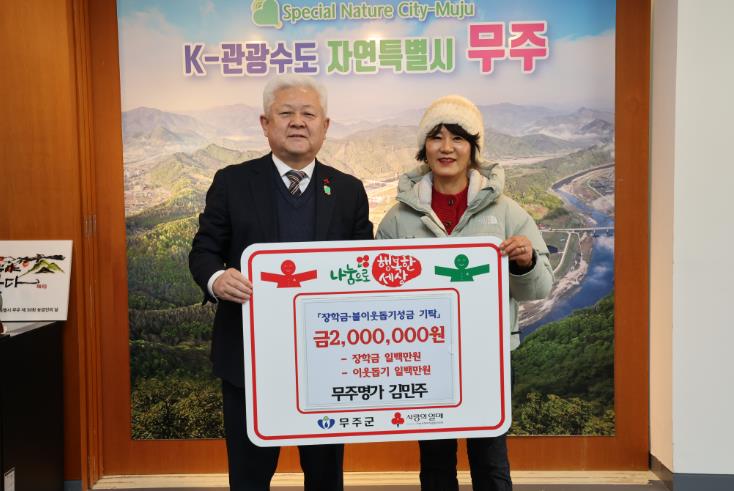 [시사토픽뉴스]무주군 무주읍에 위치한 한식 전문점 ‘무주명가’의 김민주 사장이 지난 14일 무주군에 이웃돕기 성금 1백만 원, (재)무주군교육발전장학재단에 장학금 1백만 원 등 총 2백만 원을 기탁했다.