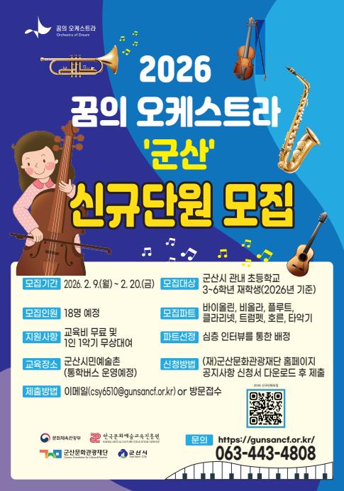 [시사토픽뉴스](재)군산문화관광재단이 ‘2026 꿈의 오케스트라 군산’과 함께 할 신규단원을 오는 20일까지 공개 모집한다.