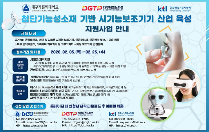 [시사토픽뉴스] 대구광역시는 산업통상부, 경상북도와 함께 ‘2026년 첨단 기능성 소재 기반 시(視)기능 보조기기 육성사업’을 본격 추진하고, 참여기업을 모집한다.