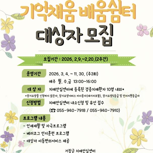 [시사토픽뉴스]거창군치매안심센터는 오는 9일부터 20일까지 경증 치매 환자 중 전문적 인지자극 프로그램과 돌봄을 제공하는 ‘기억채움 배움쉼터’에 참여할 대상자를 모집한다.