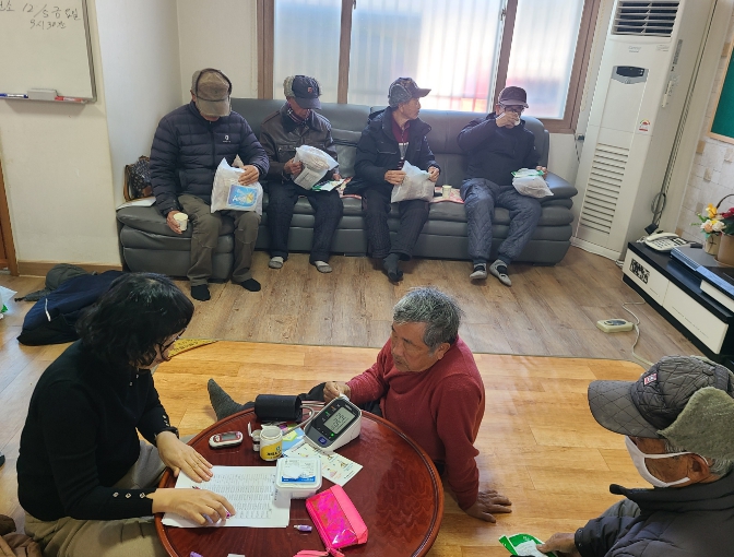 충남 계룡시가 향한1리 경로당을 찾아가 건강취약계층 대상으로 한파 및 낙상 예방 건강교육을 실시하고 있다.