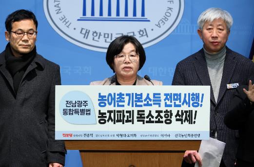 [시사토픽뉴스]전라남도의회 오미화 의원(진보당ㆍ영광2)은 지난 3일, 국회 소통관에서 전남ㆍ광주 통합 특별법과 관련해 농지파괴가 우려되는 조항의 삭제와 농어촌기본소득 전면 시행을 요구하는 기자회견을 열었다.