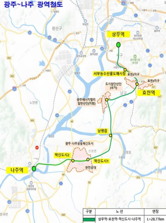광주~나주 광역철도는 총사업비 1조 7천억 원을 투입해 광주 상무역을 출발해 효천역~도시첨단산단~남평읍~광주전남공동혁신도시를 거쳐 나주역까지 총연장 28.77㎞를 연결하는 사업이다.