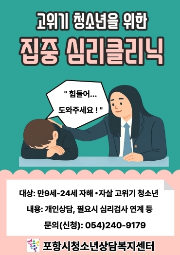 [시사토픽뉴스] 포항시청소년재단 청소년상담복지센터는 2026년부터 자해·자살 고위기 청소년 마음 회복을 위한 ‘집중심리클리닉’ 사업 운영을 시작한다.