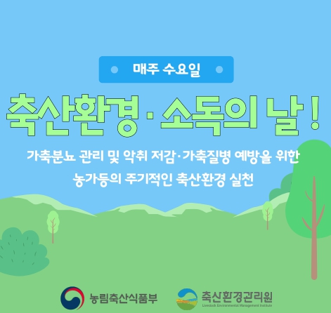 한편, 농림축산식품부는 매주 수요일을 ‘축산환경·소득의 날’로 지정하여 축산농가와 관련 시설이 소독, 청소 및 구서(쥐를 잡아 없애는 일), 구충 방제 등 축산환경 개선 활동을 실천할 수 있도록 독려하고 있으며, 자율적인 참여 분위기 조성을 통해 쾌적한 축산환경 조성에 힘쓰고 있다.