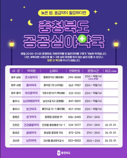 [시사토픽뉴스] 충청북도는 휴일·심야 시간대 도민의 의약품 구매 불편을 해소하고 의료 공백을 최소화 하기 위해 2026년 공공심야약국을 총 9개소로 확대 운영한다.
