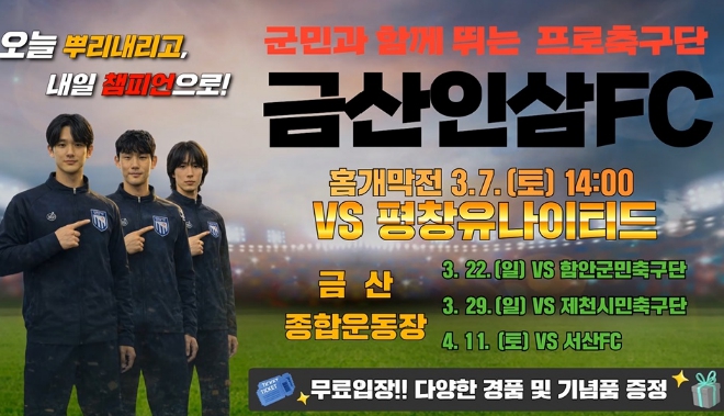 [시사토픽뉴스]금산의 열정을 대표하는 금산인삼 에프씨(FC)가 3월 7일 오후 2시 금산종합운동장에서 평창 유나이티드를 상대로 시즌 홈 개막전을 개최한다.