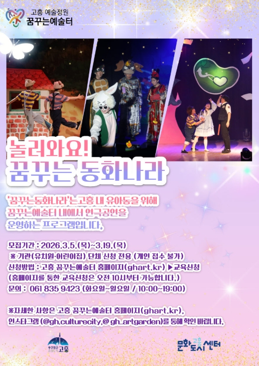 특히 이번 프로그램은 유치원과 어린이집 단위의 단체 관람으로만 운영되며, 개인 신청이나 개별 관람은 불가하다. 관람을 희망하는 관내 교육기관은 모집 기간 내 고흥 꿈꾸는예술터 홈페이지(ghart.kr)를 통해 신청하면 된다.