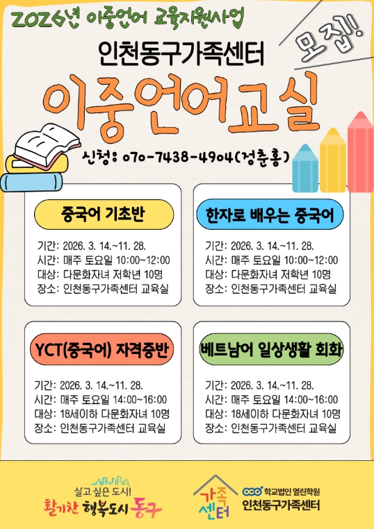 [시사토픽뉴스]인천동구가족센터는 다문화가족 및 외국인 가정 자녀를 대상으로 가정 내 이중언어 환경 조성을 장려하여 글로벌 인재 양성에 앞장설 계획이라고 밝혔다.