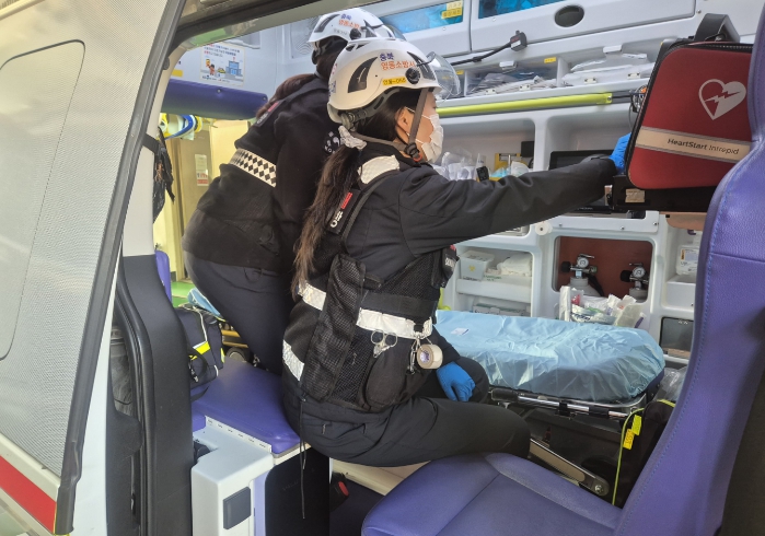 영동소방서 구급대원들이 구급차량 적재 장비를 점검하는 모습