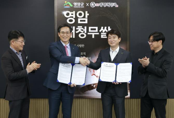 [시사토픽뉴스]영암군이 11일 군청에서 ‘일품양평해장국’ 외식 프랜차이즈 ㈜우분트월드와 영암 농특산물 판매 활성화 업무협약을 체결했다.