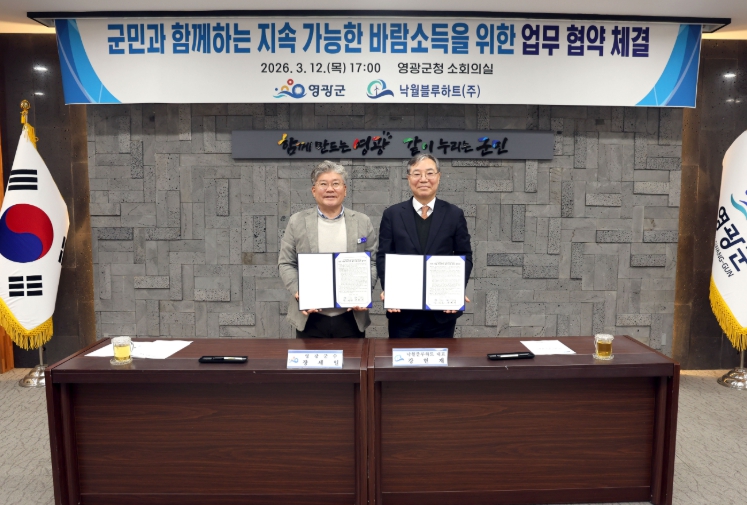 [시사토픽뉴스] 영광군은 지난 12일 영광군청 소회의실에서 ‘영광 낙월 해상풍력 발전사업’을 추진 중인 낙월블루하트㈜(대표 강현재)와 군민과 함께하는 지속 가능한 바람소득을 위한 업무 협약을 체결했다고 밝혔다.