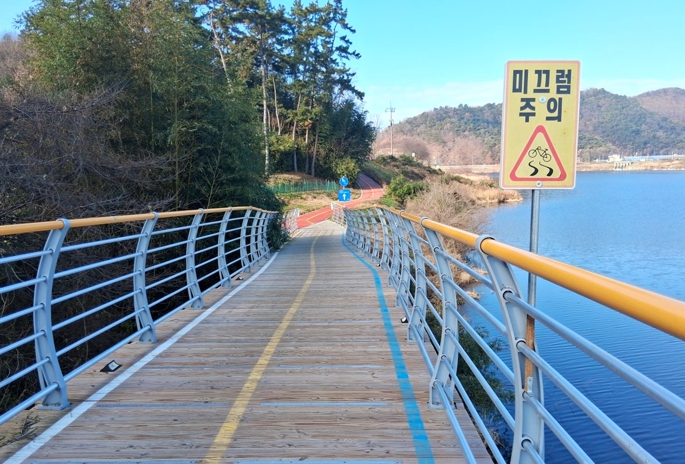 나주시가 도로시설물에 대한 사전 안전 점검을 진행했다. 사진은 나주시 관내에 위치한 자전거도로 미끄럼주의 안내 표지판.